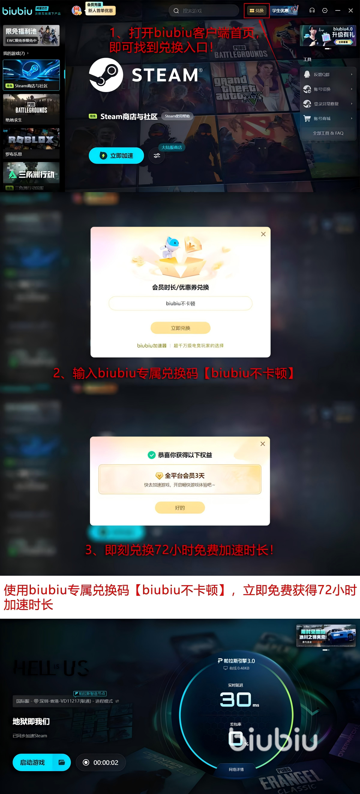 针对广大用户,还开放了诸多福利,其中最优惠的就是72小时免费服务时间礼包了,要用【biubiu不卡顿】才能换到,另外要是本身也是新人,其实首次登录也会得到24小时免费服务时间,也就给新人用到了96小时。