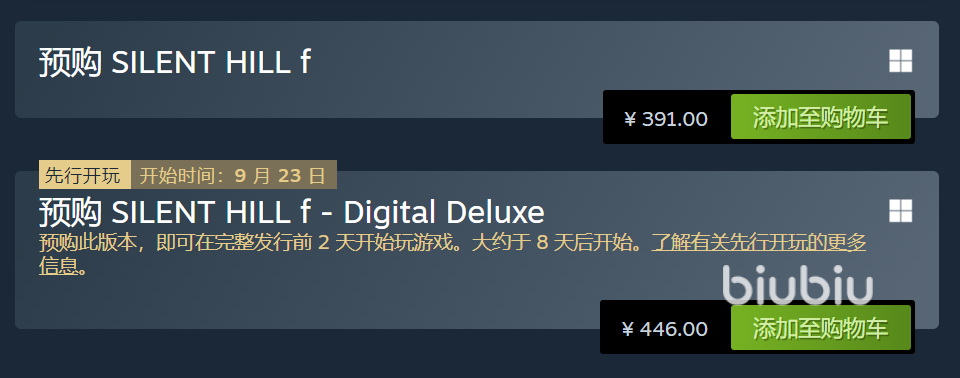 目前游戏已在Steam国区开放预购,标准版391元,包括游戏本体和特典(白色水手服、护身符【牡丹】及实用道具包)。豪华版446元,在标准版基础上,加赠数字美术设定集、原声带、粉色兔子服装,以及 9月23日提前48小时优先体验资格,定于9月25日正式发售。