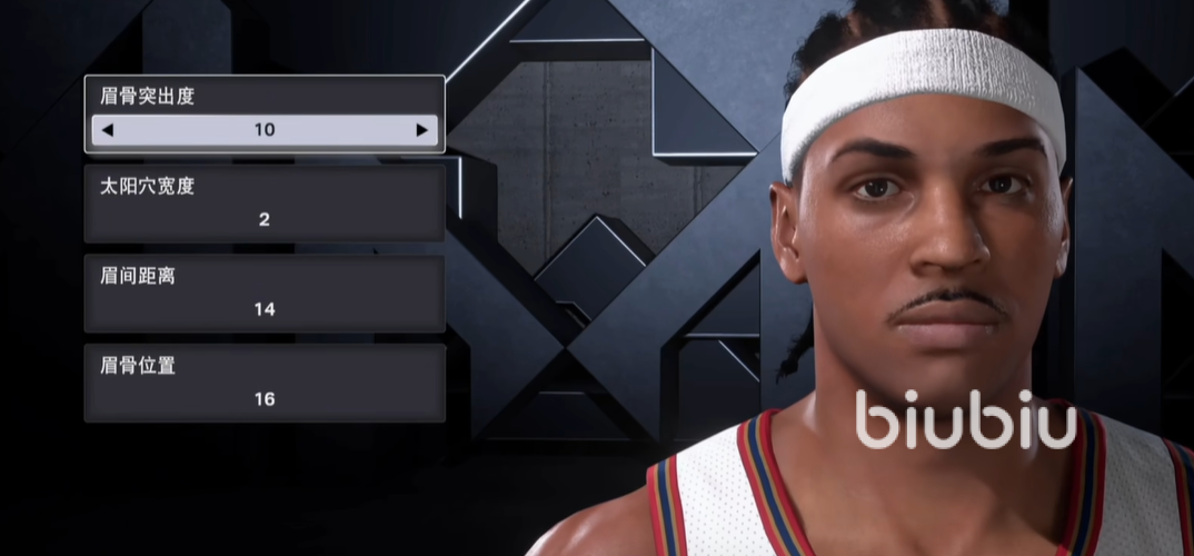 我这里就捏一个著名球员科比的捏脸数据,首先发型直接选光头,贴合其经典形象;头骨选3,宽度和高度都调成0,保证头部轮廓的基础形态。眉骨默认编辑,从上到下按对应数值调整,突出眉眼间的立体度;眉毛选8号样式,眼睛选6号样式,再按给定参数调整眼睛的各项细节,还原眼部神态。