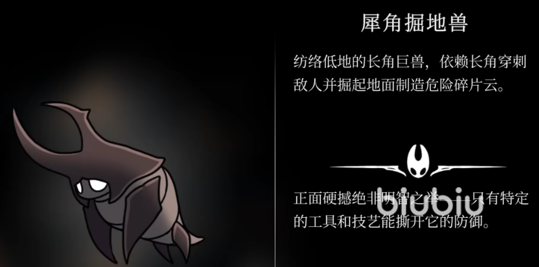 犀角掘地兽:忆廊有一只,朝圣者营地右边门内有一只,具有挖掘或钻地特性的敌人。