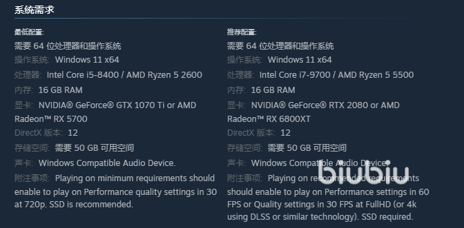 推荐配置则针对追求高画质和流畅度的玩家设计,能提升整体沉浸感,同样,系统方面Windows 11 x64版本用起来更顺手,兼容性和稳定性都相当不错。处理器选AMD Ryzen 5 5500就挺合适,运行AI计算和复杂特效时完全够用。内存16GB RAM足够应对多任务需求,实际体验中切换程序很顺畅。显卡要求就比较高了,至少得AMD Radeon RX 6800XT这个级别,才能完美呈现光追效果和4K高清画面。DirectX版本务必选择12,不然游戏容易卡顿甚至闪退。存储空间还是50GB,但加载速度明显提升,整体游戏体验直接上了一个档次。