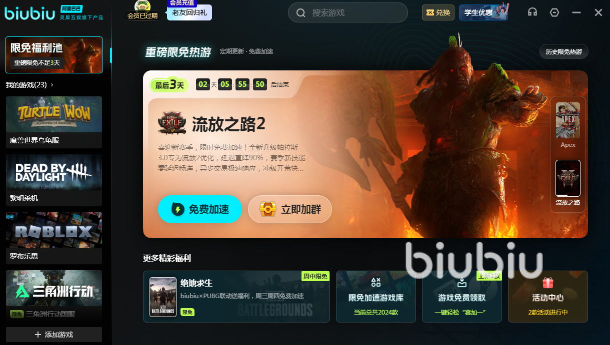 为了让每一个玩家都可以享受到稳定的游戏体验,加速器就给所有新老用户准备了丰厚的加速时长。新用户在第1次注册登录之后就可以领取24小时。所有用户都可以通过使用兑换码【biubiu不卡顿】获取3天的免费加速时长。让大家可以零成本去享受优质的加速服务。加速器近期还迎来重磅升级,携手冠军选手Aixleft共同打造专属加速方案。他通过自己在射击游戏中的丰富经验,深度参与加速器优化过程针对游戏的特性去量身定制加速的策略。此次升级还会引入全新的帕拉斯引擎3.0,这一个引擎在数据处理这方面就可以有效实现全面的提升。