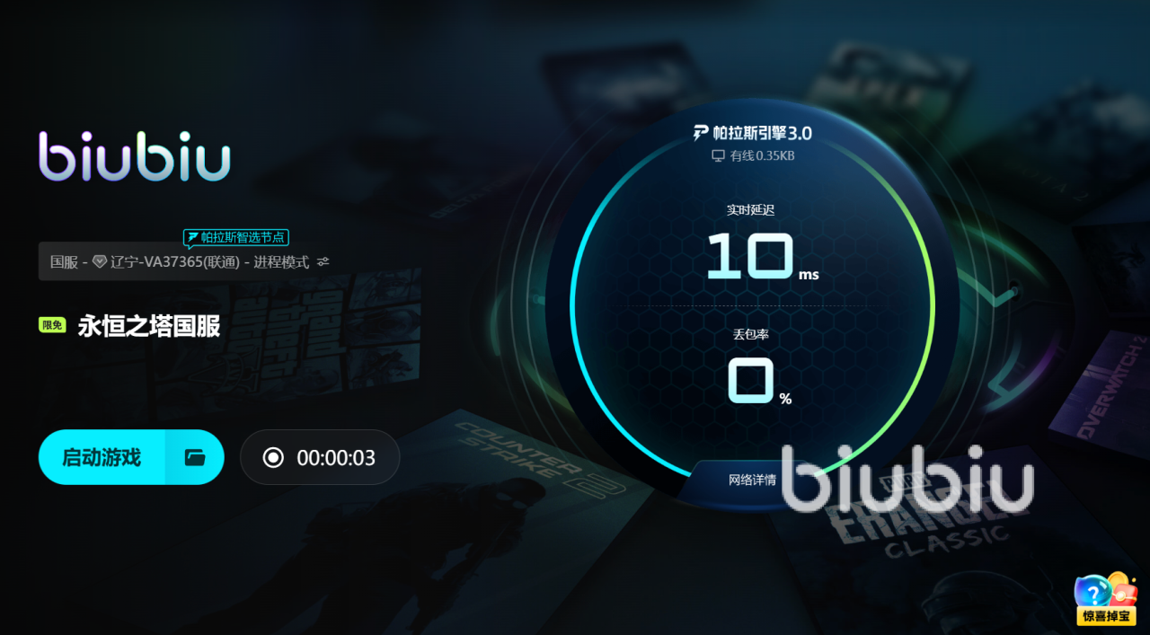 从玩家的操作感受来看,biubiu加速器依旧延续了清爽直观的设计风格。玩家启动客户端,在搜索框里输入永恒之塔,就能一键开启加速。选择对应的加速模式并点击开启,系统就会自动完成优化,无需繁琐设置。后台占用极低,不会影响电脑性能,无论你玩哪类网游,都能一键开启加速,实现一款软件多场景通用。