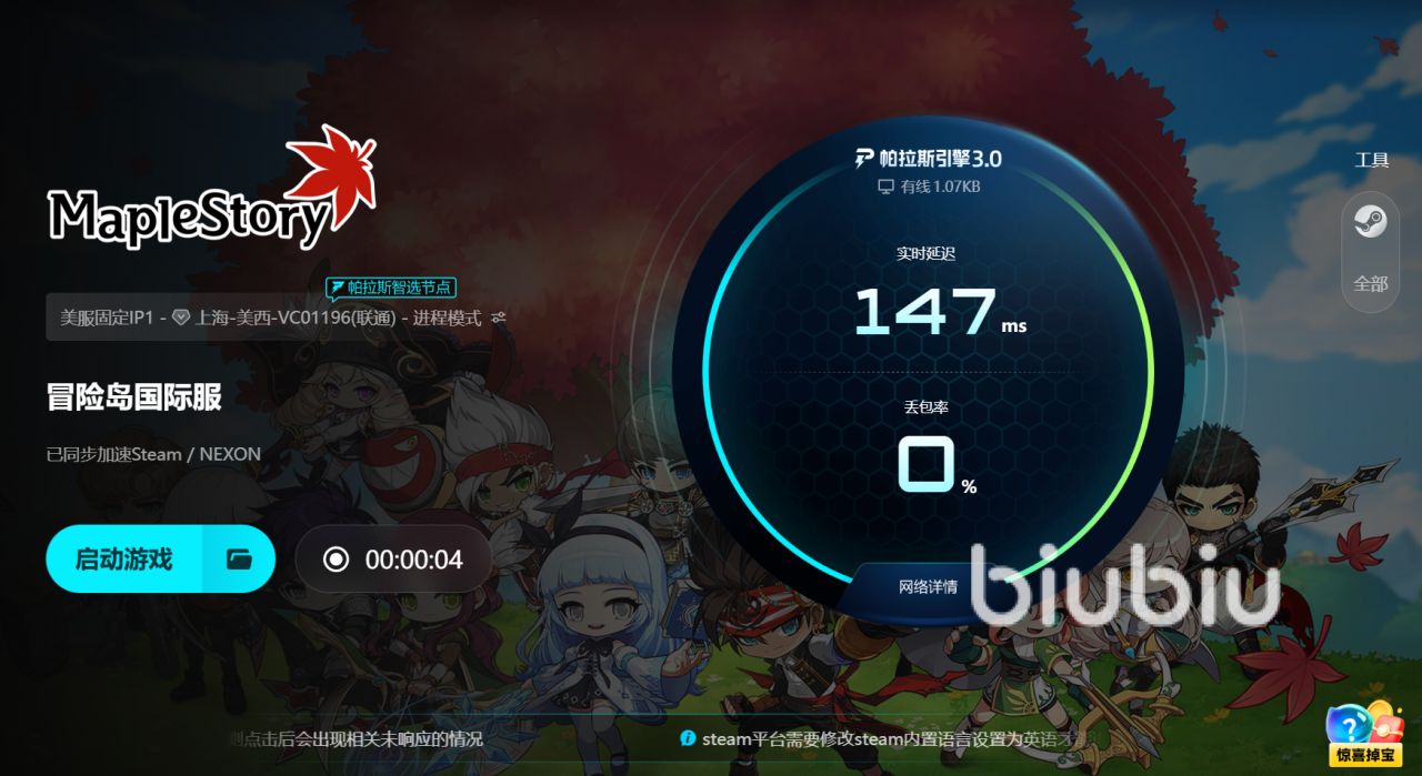 遇到冒险岛国际服登录难题?开启biubiu加速器,一键优化网络直达游戏。无论是长时间刷任务还是连夜打副本,它都能保证网络稳定,减少掉线和异常,让你专心投入游戏世界。毕竟,只有稳定流畅的连接,才能真正释放《冒险岛》的魅力,让你体验到完整而顺滑的冒险旅程。