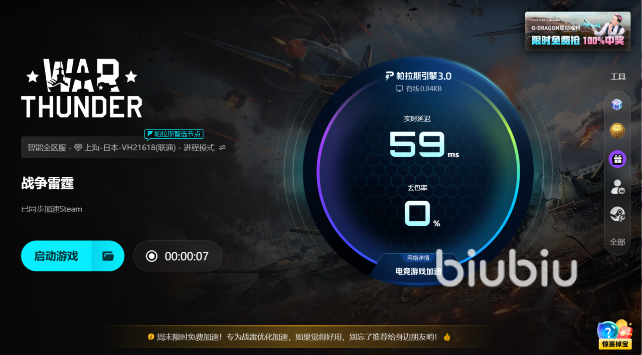 如果你也正在被《战争雷霆》的延迟和掉线困扰,不妨在进入战场前就先开启biubiu加速器。它能帮你稳定连接、降低延迟,让玩家将注意力完全集中在战术指挥与火力输出上,尽情体验每一场紧张刺激的坦克鏖战和空中对抗,享受全程畅快的战斗节奏。