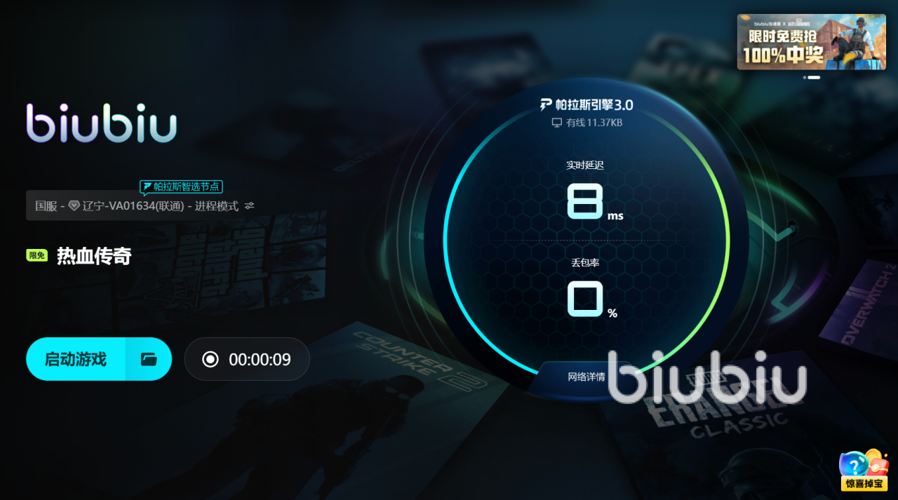 技术实力才是biubiu能够成为传奇玩家首选的关键。它搭载最新的帕拉斯引擎3.0,能够实时监控你的网络状况,动态调度最优线路,自适应优化跨区传输链路,就算在晚高峰攻沙、万人同屏时也能毫秒级切换备用通道,最大限度避免丢包和延迟,让你全程稳定在线,不再因为闪退错失关键时刻。更让人安心的是,biubiu体验官FPS职业冠军Aixleft也参与了biubiu的调优。他把职业赛场对低延迟和高稳定性的要求带入优化方案,每次测试都以毫秒级延迟和操作同步为标准,反复打磨帕拉斯引擎的表现,确保在高负载情况下依旧能保持稳定。