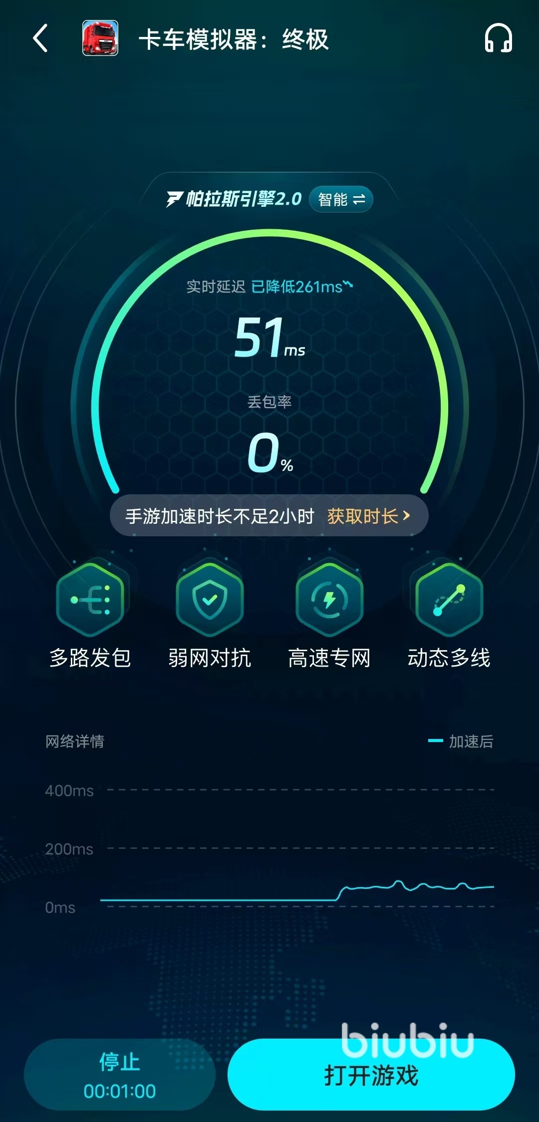 操作上更是简单到极致,打开biubiu,搜索“终极卡车模拟器”点一键加速就完事。界面干净直观,不需要任何复杂设置。更赞的是,它还能顺便加速大多数平台,PC上的模拟驾驶、赛车类游戏也能享受同样的稳定体验,一款软件多场景通吃。