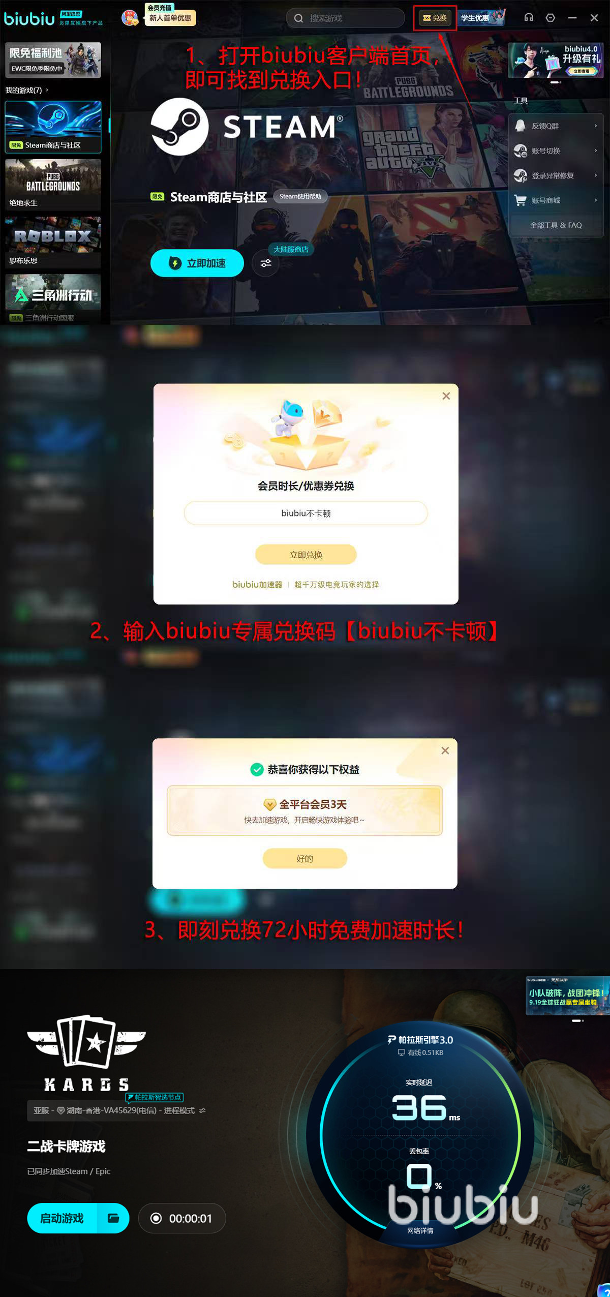 其实优化对游戏非常重要,同样对biubiu这样的加速器也会很重要,biubiu还与电竞冠军Aixleft合作,开展biubiu优化,近期版本上线后,大家可通过参加几个福利活动来免费体验,有新户注册可免费体验送24小时,还有大家可得免费3天体验的口令活动,仅需用【biubiu不卡顿】在首页兑换即可,当然新人两个活动累计能领96小时。