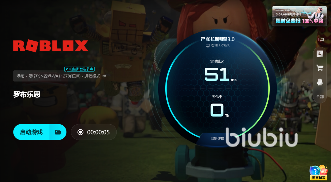 全面升级后的biubiu加速器接入帕拉斯引擎3.0,实时追踪你的网络波动,并在后台动态调度最佳线路,并在链路拥堵或波动时即时切换,避免因丢包和延迟飙升造成的卡顿和掉线。与传统的固定线路加速不同,它支持动态调度和自适应优化,即便在跨区联机或高峰时段,也能保持稳定的传输体验。职业FPS冠军Aixleft也作为biubiu的监察助理进行设计,把职业比赛中的高标准直接应用到加速器优化中,使biubiu在应对《Roblox》这种多人在线、实时的同步的平台时,依旧能保持稳定的表现,让玩家专注于创造和游玩,而不是频繁被网络问题打断。