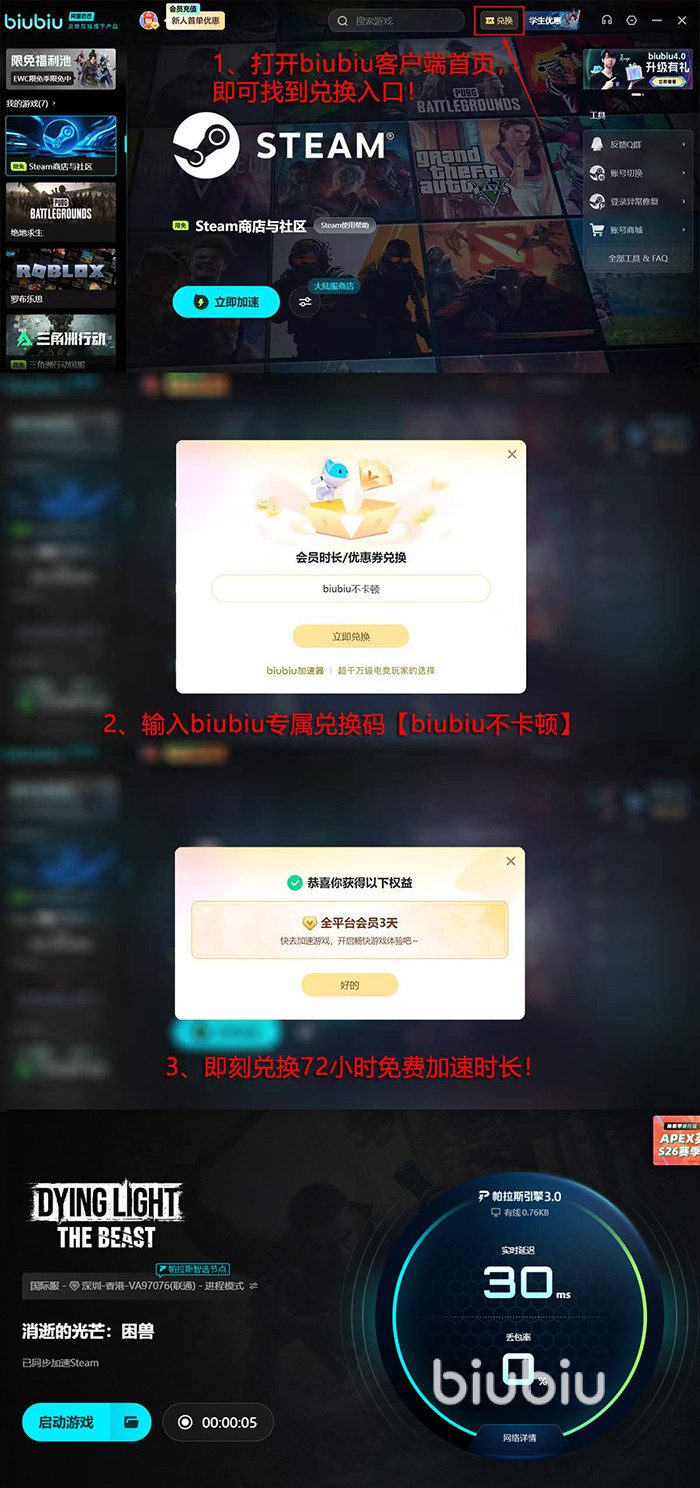 同样是客户端,biubiu此次在程序深层次优化上与电竞冠军Aixleft合作,其从专业角度给了很多帮助。新版本上线后,biubiu也带来了许多福利让大家免费体验,比如新人免费24小时福利,全员3天口令兑换活动,只需输入【biubiu不卡顿】在程序的第一页兑换即可,而且,新人还能积攒得到九十六个小时,福利诚意非常足。
