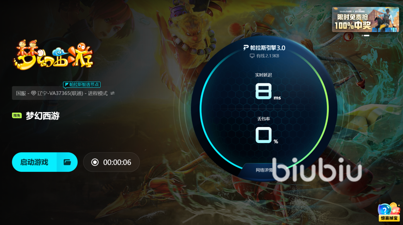 所以,如果你也正被梦幻西游掉线、卡顿、延迟困扰,不如现在就下载biubiu加速器,先用注册赠送的免费加速时长试一试,打开之后就能稳定开荒副本、流畅打帮战,再也不用担心关键时刻卡顿掉线。不再担心关键时刻掉线,轻松拿下奖励。让每一分努力都不会白费,把更多时间花在享受游戏乐趣上。