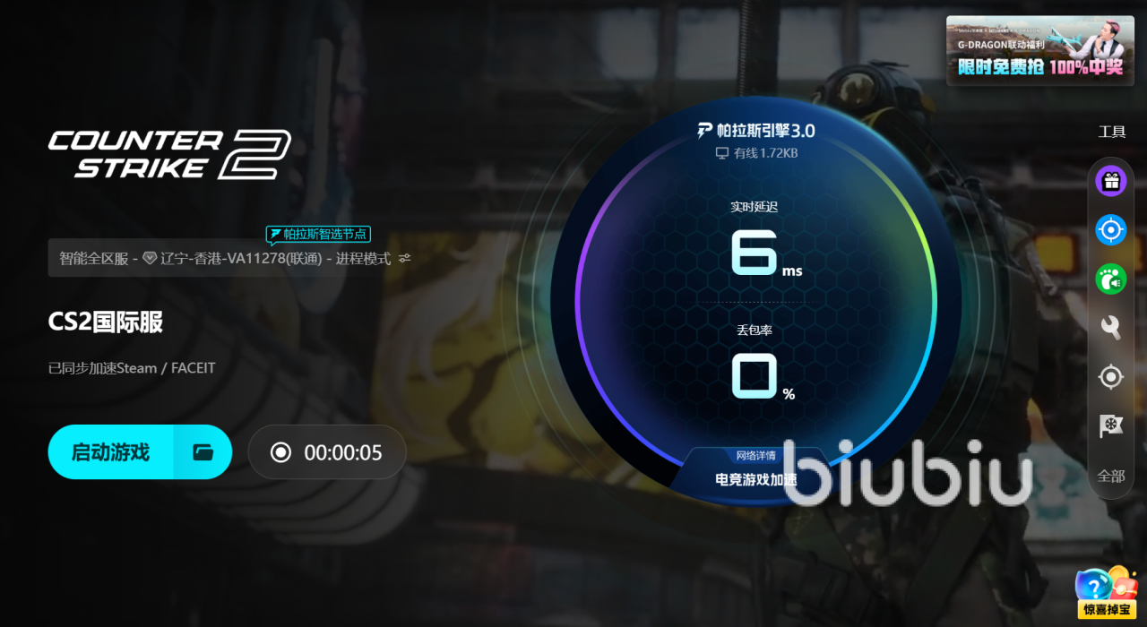 全面升级后的biubiu加速器采用帕拉斯引擎3.0内核,能够实时采集延迟、丢包率等关键网络数据,持续追踪网络波动,为自动匹配最优线路打下基础。帕拉斯引擎3.0强调动态调度和自适应优化,即便在高负载或跨区联机的情况下,也能保证稳定传输。作为参与调优的biubiu体验官,FPS冠军Aixleft把职业级的延迟控制与稳定性要求融入每一步优化策略,即使是CS等高强度对局,biubiu依旧稳定运行,让玩家全情投入战术和团队协作。