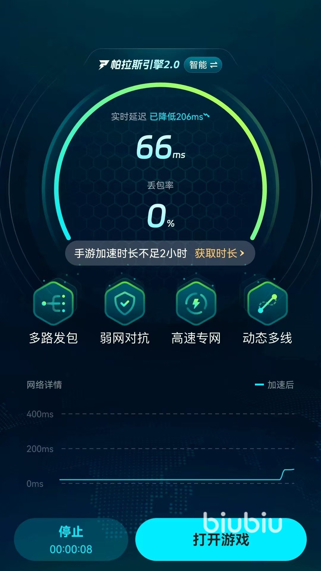 现在biubiu所使用的帕拉斯引擎具有多种核心科技相融合的优势。例如自身的动态多线,能够对游戏服务器进行精准定位,这样找到所在地之后,再配合上覆盖全球的高速专网,实现游戏数据直达进行交换,这样延迟就大幅度降低。也减少了因为服务器延迟带来的丢包抖动等情况。在移动端加速的时候,还能够自由选择不同的线路,在4G和WiFi间进行切换,以应对不同的网络环境。在其他技术方面,biubiu还采用了帕拉斯大数据预判重传技术,针对的就是本地网络出现波动的时候,就能实时补发数据包,达到了毫秒级响应速度。可有效避免卡顿掉线,在一些网络比较弱的场景中有着很好的作用。