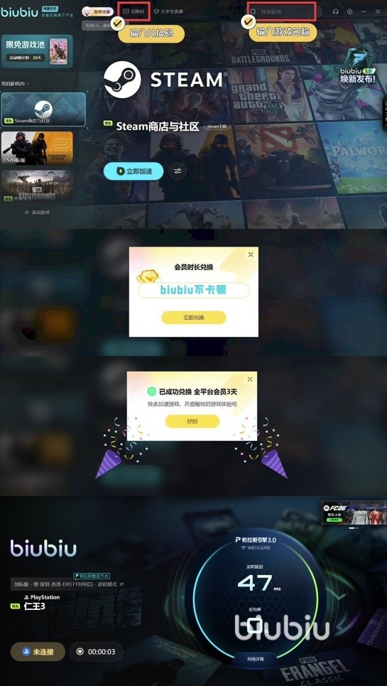 加速器全面搭载帕拉斯引擎3.0,结合智能路由与多线程加速技术,保证数据传输高效顺畅。新用户首次注册就能拿到24小时免费优化时长,让大家可以零门槛体验优化效果;接着输入兑换码【biubiu不卡顿】,还可拿到额外三天的免费加速时间。