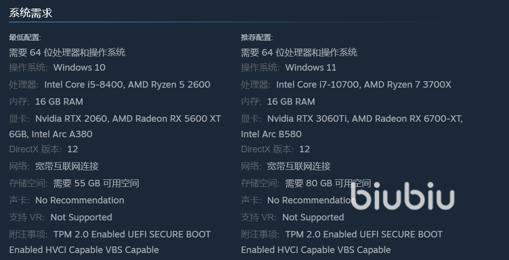 若想追求顶级享受,玩家应选择推荐配置要求,同样基于64位架构,操作系统升级为Windows 11,优化性能兼容性。处理器需更强,如Intel Core i7-10700,内存保持16GB RAM,显卡要求更高端的Nvidia RTX 3060Ti、AMD Radeon RX 6700-XT或Intel Arc B580,这些支持4K分辨率和极致细节渲染,提升爆炸场景的视觉冲击。存储空间增至80GB,便于后续更新与DLC内容。