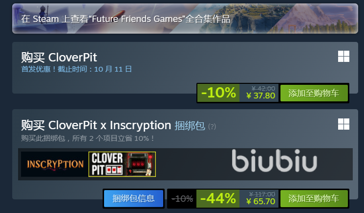 CloverPit发售平台介绍给大家了,我们在Steam上轻松就能找到商店页面,如果想要更多,还可以购买捆绑包,同时畅玩两款游戏。如果只买一份,本游戏当中包含150+道具,还有多结局分支,搭配上锈迹牢房作为场景,也能带给玩家足够的恐怖体验。