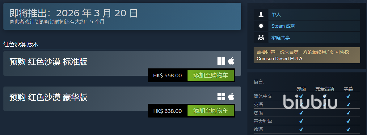 预购流程也很简单,在Steam找到红色沙漠,选版本点“添加至购物车”,核对信息无误即可。等发布日期一到,Steam会自动下载到库,直接安装启动就行。定价方面,国区标准版268元,豪华版328元,不过各地区版本售价存在差异,比如港区标准版558港币(约合500元人民币),而且预购特典各区不通用,大家在购买时要选好适合自己的。