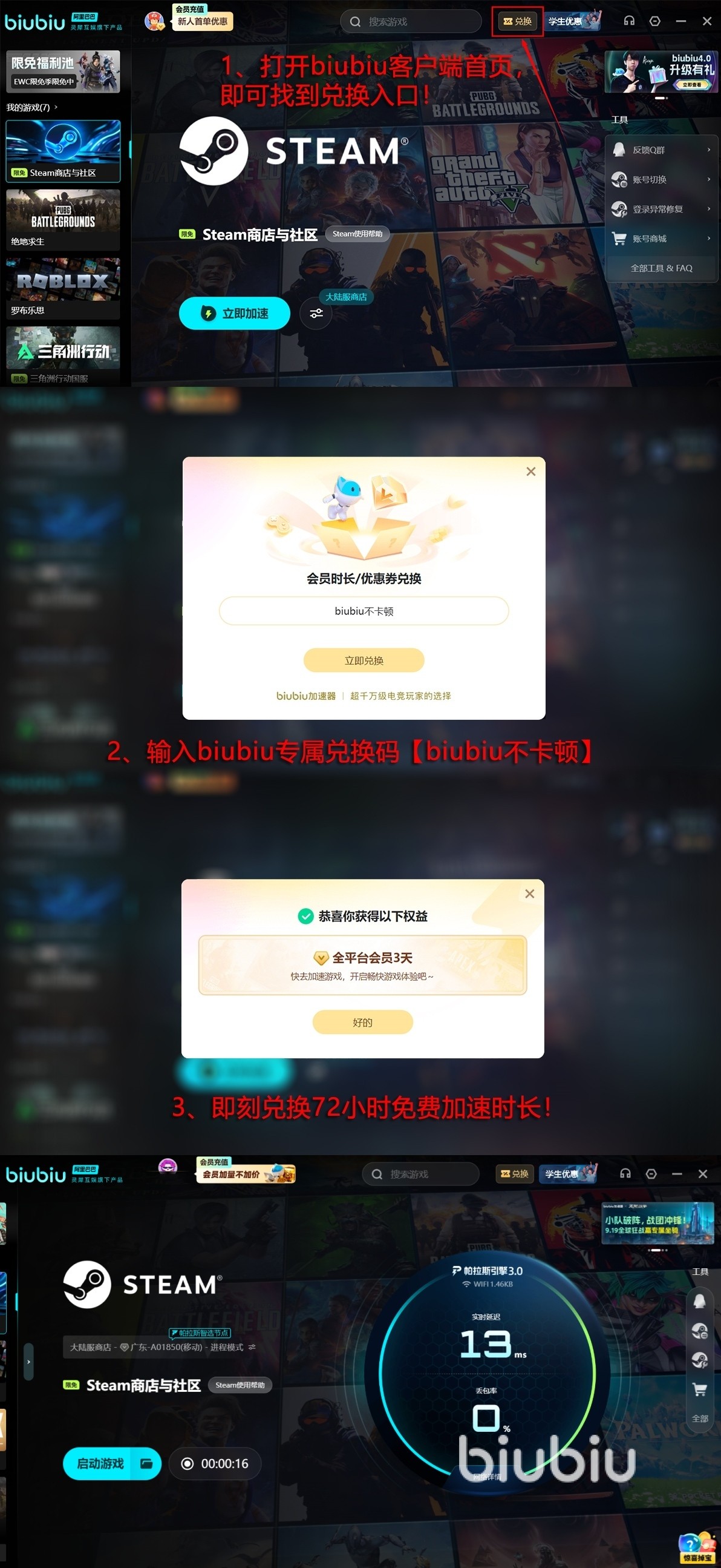 玩家们期待的福利来了,biubiu新人用户登录领24小时免费加速,而新老用户输【biubiu不卡顿】得72小时,亲自体验稳定网络打游戏的快乐,觉得效果不错再优惠充值也不迟。