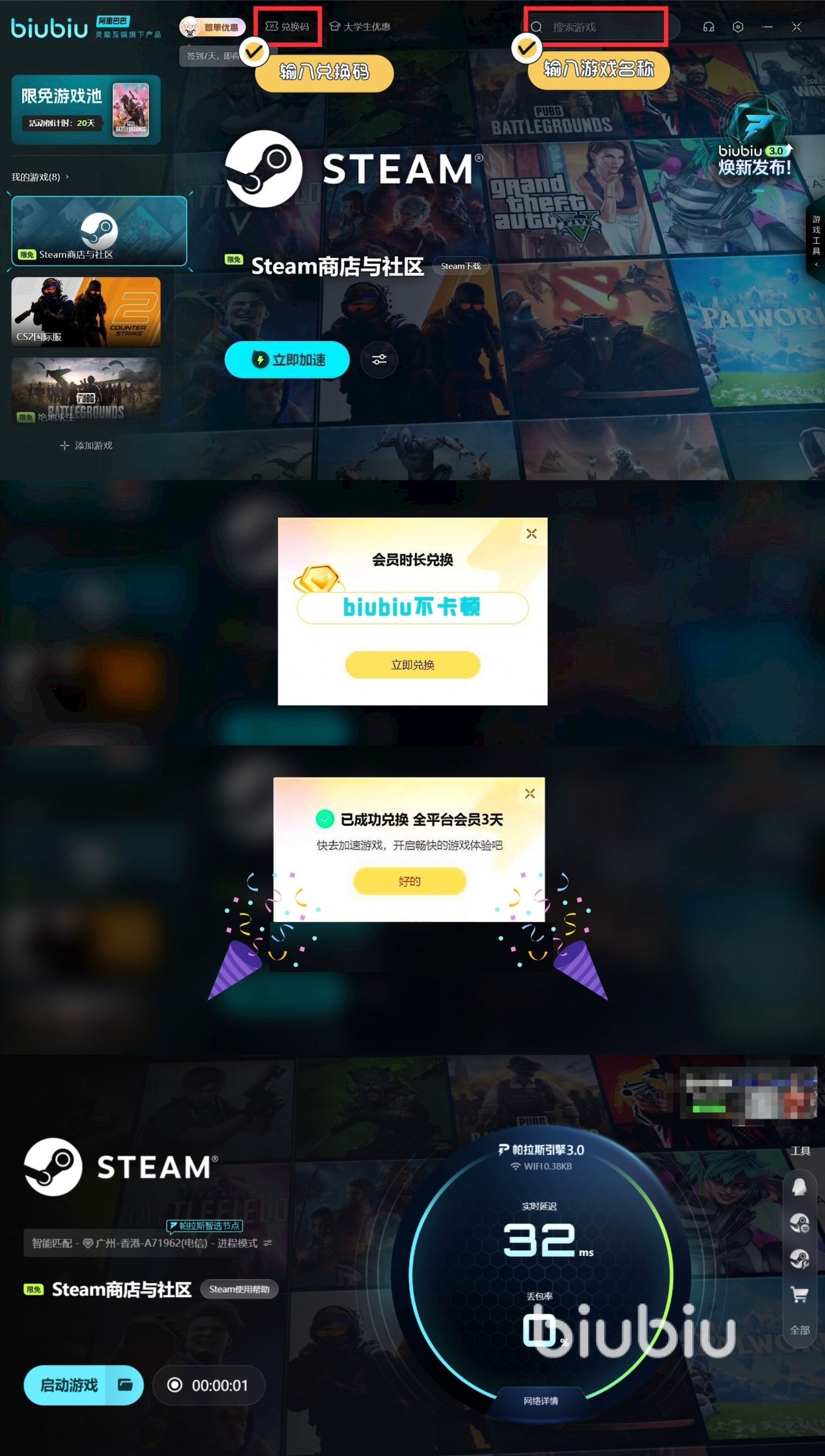 与此同时还给大家准备了很多的惊喜福利,对于首次注册的伙伴们,赠送了24小时免费加速时间,跟着平台的其他用户,通过【biubiu不卡顿】,在原有的基础上还能获取到3天的免费继续优化时间,轻松应对首发热潮,畅享无延迟的无双战场。同时可以关注该加速平台的对应游戏社区,每天都会更新各种热门资讯以及游戏攻略,对于新手伙伴前期有很大的帮助。