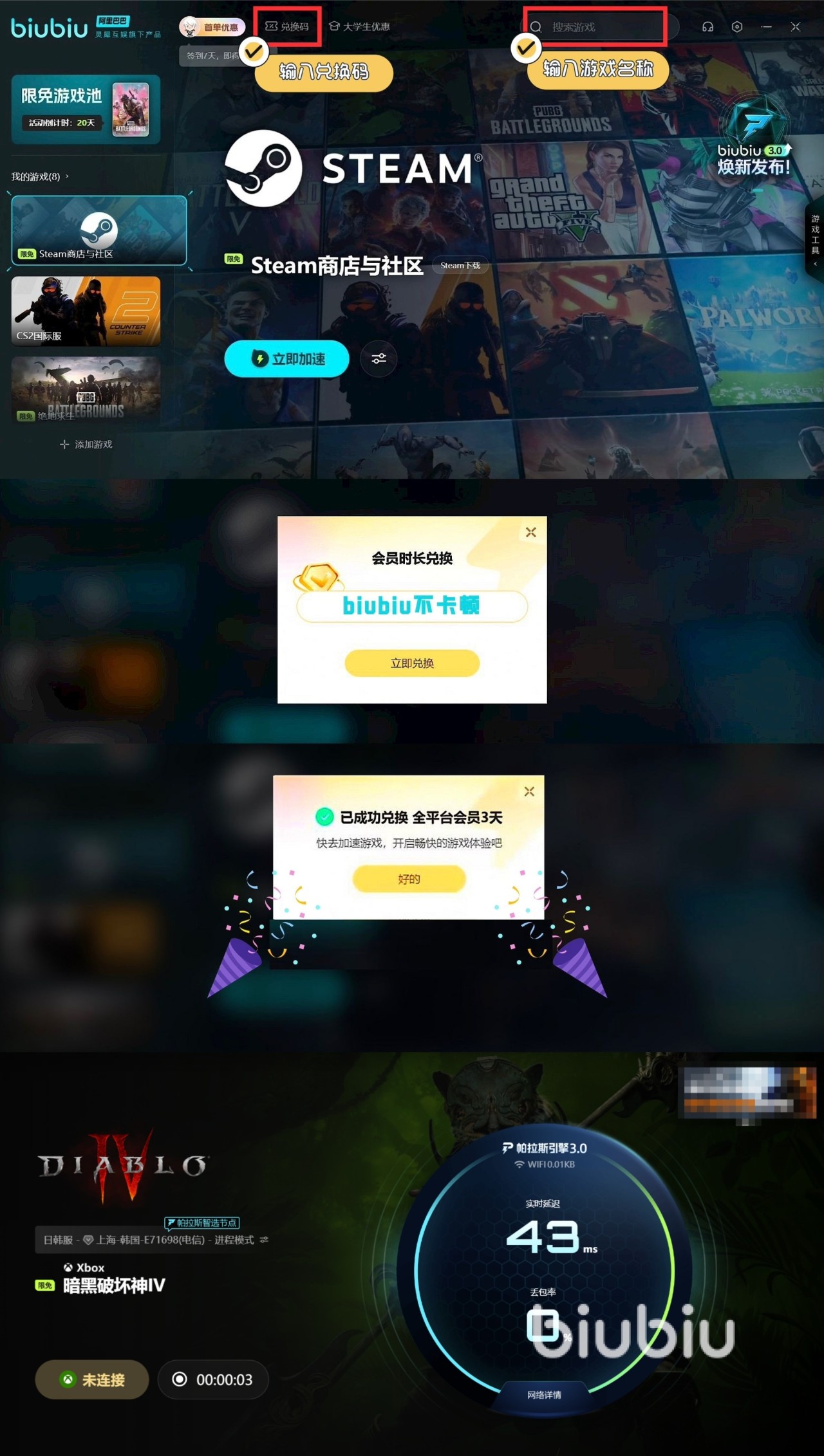 值得一提的是,它对新用户也极为友好,完成注册就能得到平台赠送的24小时免费体验时间,同时输入兑换码【biubiu不卡顿】,还能额外得到3天继续免费加速福利。