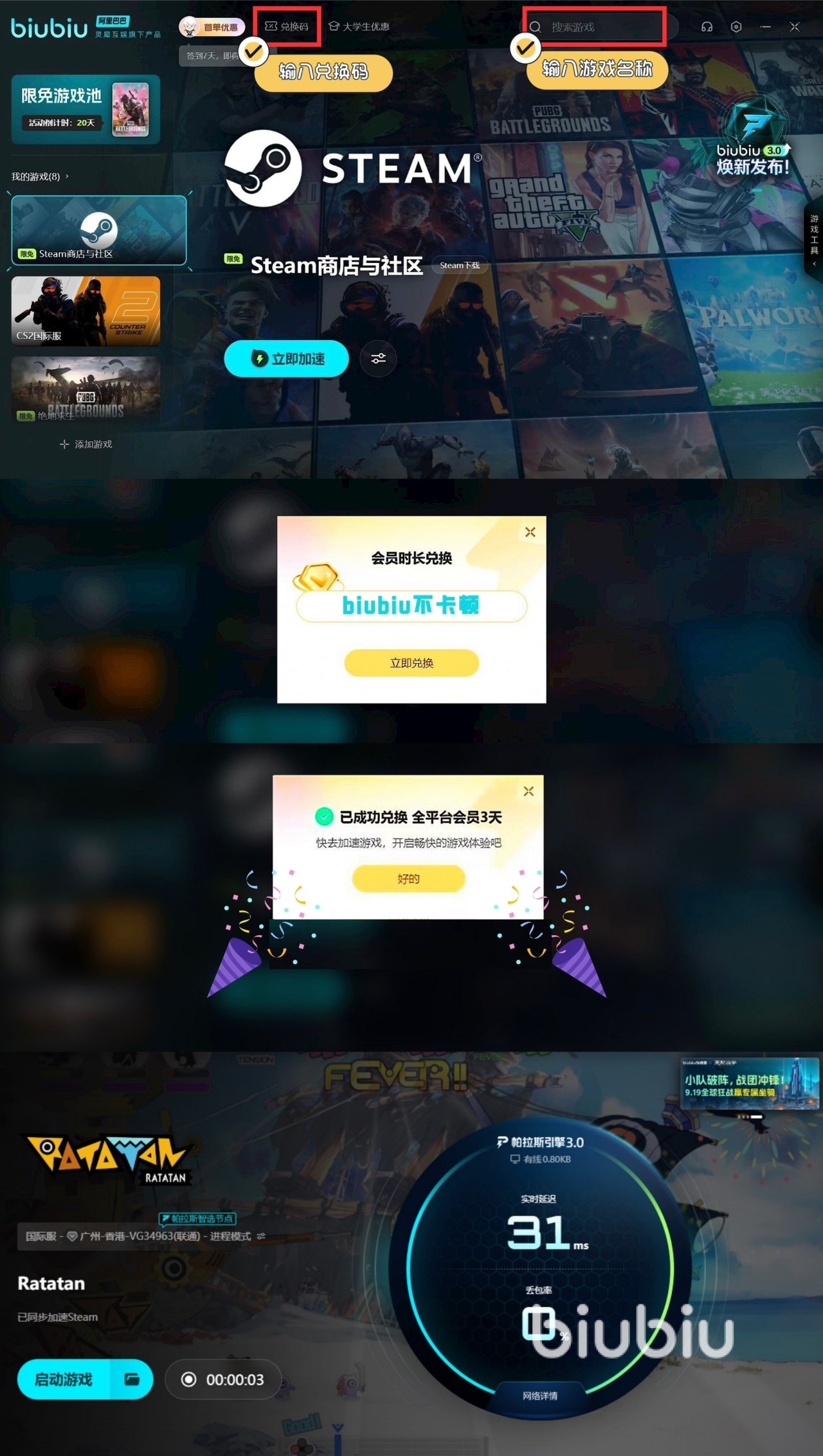 新用户在第一次注册之后是可以拥有24小时免费体验时间的,接着可以跟随平台的其他用户,通过【biubiu不卡顿】还能兑换到三天的继续优化时间,对于喜欢玩游戏的宝子们来说,简直是太幸运了,海量的游戏池中很多的经典热门游戏大家都可以尝试。