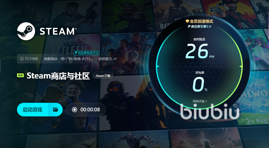 这款游戏在steam上线,通过steam平台加速和登录游戏。游戏之前,biubiu提升实时网速,玩家们优化游戏体验,它使用方式简单,玩家通过官方网站安装软件之后,填写账号信息,完成用户登录。开启biubiu系统之后,玩家可以一键开启加速,设置相关的服务器和模式,查看当前加速效果。