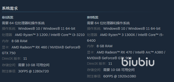 马上这款游戏会在10月2日的时候登录NS以及PS5平台,主机玩家想完成配置需求很简单,只要拥有对应机器就行了。不过要是想在pc平台上玩,最好做到达标中配,能稳定流畅运行游戏高画质,推荐i5-6400的cpu搭配gtx960的显卡,处理内存有8GB就能玩的很好了。具体要求都展示给大家之后,各位抓紧去完成配置需求。