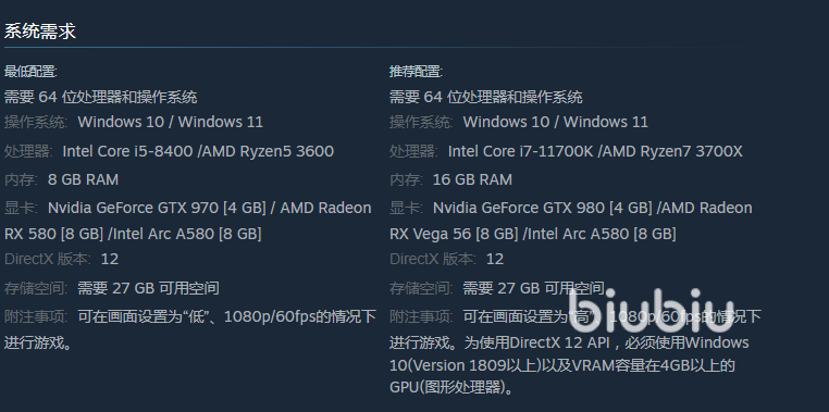 对画面以及体验感要求不高的小伙伴来说,达成最低配置就能启动游戏了,这个需求一点都不高。当下需要Intel i5-8400的处理器,显卡要求不高,有GTX940级别就够,存储内存达到27GB,运行内存有8GB即为达标。有追求,想开高画质欣赏美景的小伙伴,需要将处理器升级到i7-11700K,显卡达到GTX980,就能保持开高配也流畅运行了。