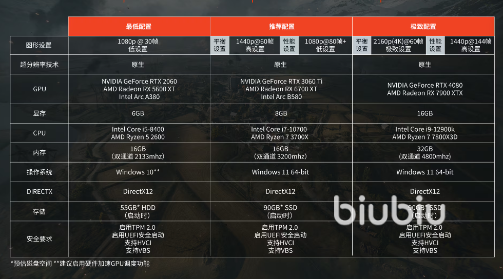 本次分了3个档位,最低配置即要求RTX 2060级别的显卡和16GB双通道内存,也是说明了游戏对硬件的依赖,不过此前BETA测试时候有玩家反馈,使用比官方最低要求更老的硬件(如GTX 10系列或GTX 900系列显卡),通过将画质设置调至最低,也有可能实现流畅运行。