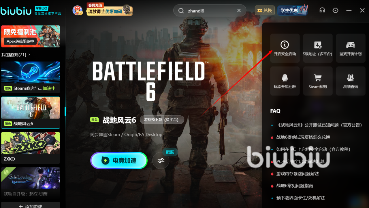 还有一点一定要注意,正式版中将会启用一个反作弊系统。需要在主板BIOS中开启安全启动,建议玩家在游戏发售前提前检查并确保自己的系统支持这些功能,以免影响正常游戏。如果不会操作的话,推荐直接打开biubiu加速器的战地6页面,右侧工具栏中一键设置,省心省力。
