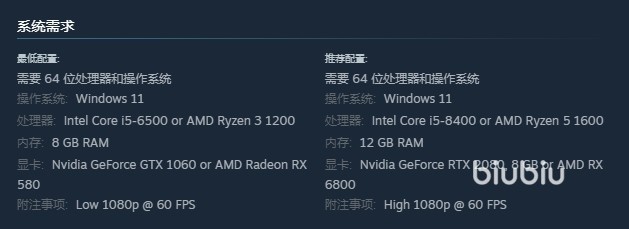 官方公布了配置信息,游戏需要在64位windows 11系统上运行,此外,最低需要8 GB内存和1060的显卡,处理器也是至少i5的6500,升级则是推荐i5 8400处理器、12 GB内存以及2080的显卡,以上介绍都是N卡,用相对应的同级A卡替换也可以满足。最低配置可以流畅展现基础动画场景,如果往上升级设备,则能够显示更完整的画质与光线追踪,包括梦境中的恐怖细节。