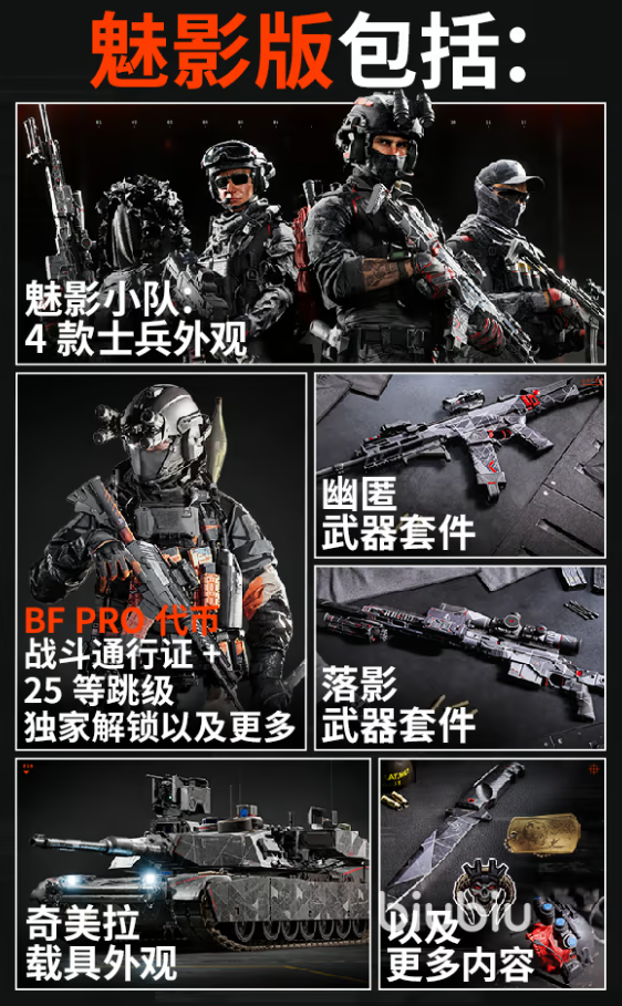 而魅影版468元,在标准版基础上追加了四大类增值内容:一是“魅影组合包”,含4款专属士兵皮肤、2组武器套件、近战刀皮肤及载具外观;二是第一赛季战斗通行证与25级跳级代币,可快速解锁进度;三是经验值加成套组,加速角色成长;四是《战地风云》Pro代币,用于优化特定兵种能力。这一版增加的主要是个性化外观和减少重复刷取时间,不过注意一下皮肤的暗光地图隐蔽性,测试中曾有质疑,建议关注后续优化。