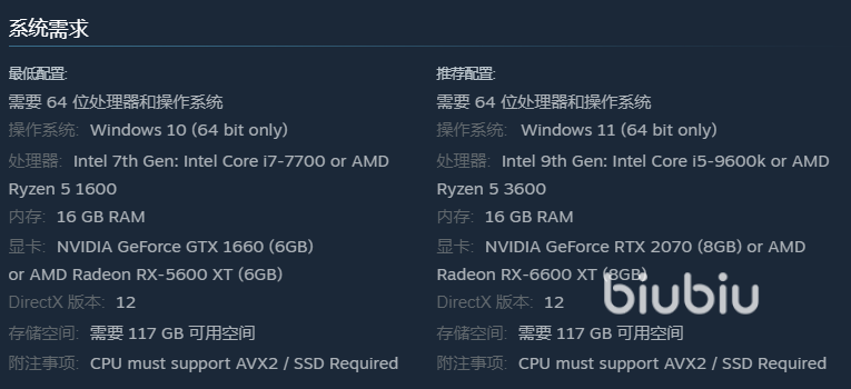 除此以外还需要注意全档位均需117GB SSD空间与AVX2指令集支持,目前试玩版已上线Steam与Epic平台,不妨可借此测试一下设备的性能吧。而且上线后还会采用D加密技术,或许会一定程度上影响一些流畅度,建议遇到卡顿闪退等问题的时候,适时开启biubiu加速器来帮助提速。