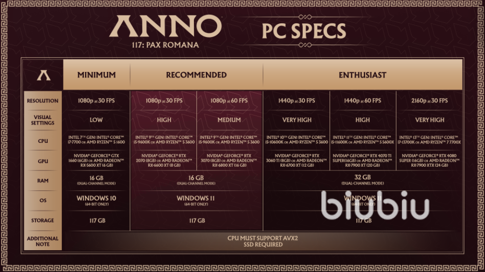 总之,《纪元117:罗马和平》的配置信息就为大家分析这么多了,由于游戏对硬件具有一定的硬性要求,因此老旧机械硬盘或不支持AVX2的CPU可能无法运行,建议根据自身预算优先升级显卡与内存。总体上来看,本作配置门槛虽高于传统策略游戏,但分级清晰的档位也为不同的硬件水平提供了灵活选择。最后希望大家都能沉浸于罗马帝国的建造史诗中。