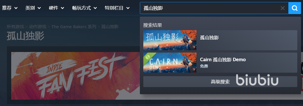 其实《孤山独影》在首发阶段即内置简体中文界面与字幕,而其正式英文名为《Cairn》。因此我们Steam平台直接输入中/英文名都可搜到商店页面。