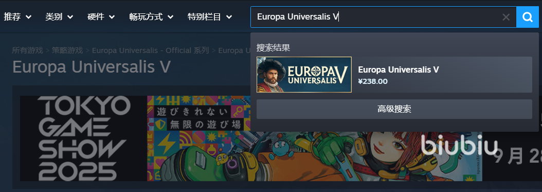 这款游戏在steam平台上是没有中文名称的,因此我们需要输入的是其正式英文名,”Europa Universalis V“。建议直接复制,避免错漏。而且该作已确定于2025年11月4日正式发售了,现已在Steam开放预购。页面上还详细的介绍了该作品在未来的发布计划,便于玩家选购。