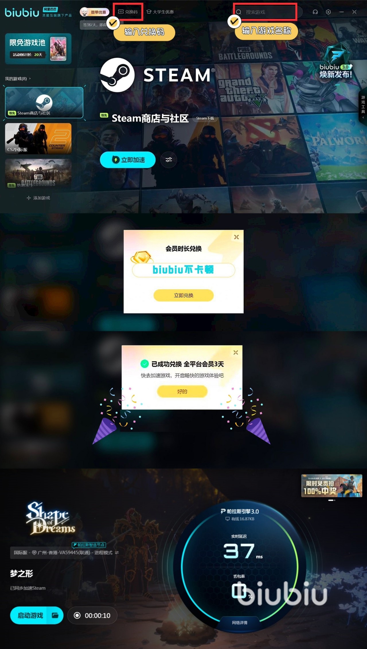 同时Biubiu这款加速工具还为为新用户提供专属福利,首次注册登录就能成功带走24小时免费加速时间,让伙伴们无忧体验游戏初期内容。另外在平台内输入口令【biubiu不卡顿】,还可额外获得72小时加速权限,总计高达96小时的免费使用机会,适用于平台支持的多款热门游戏,助力新人大家顺利起步。