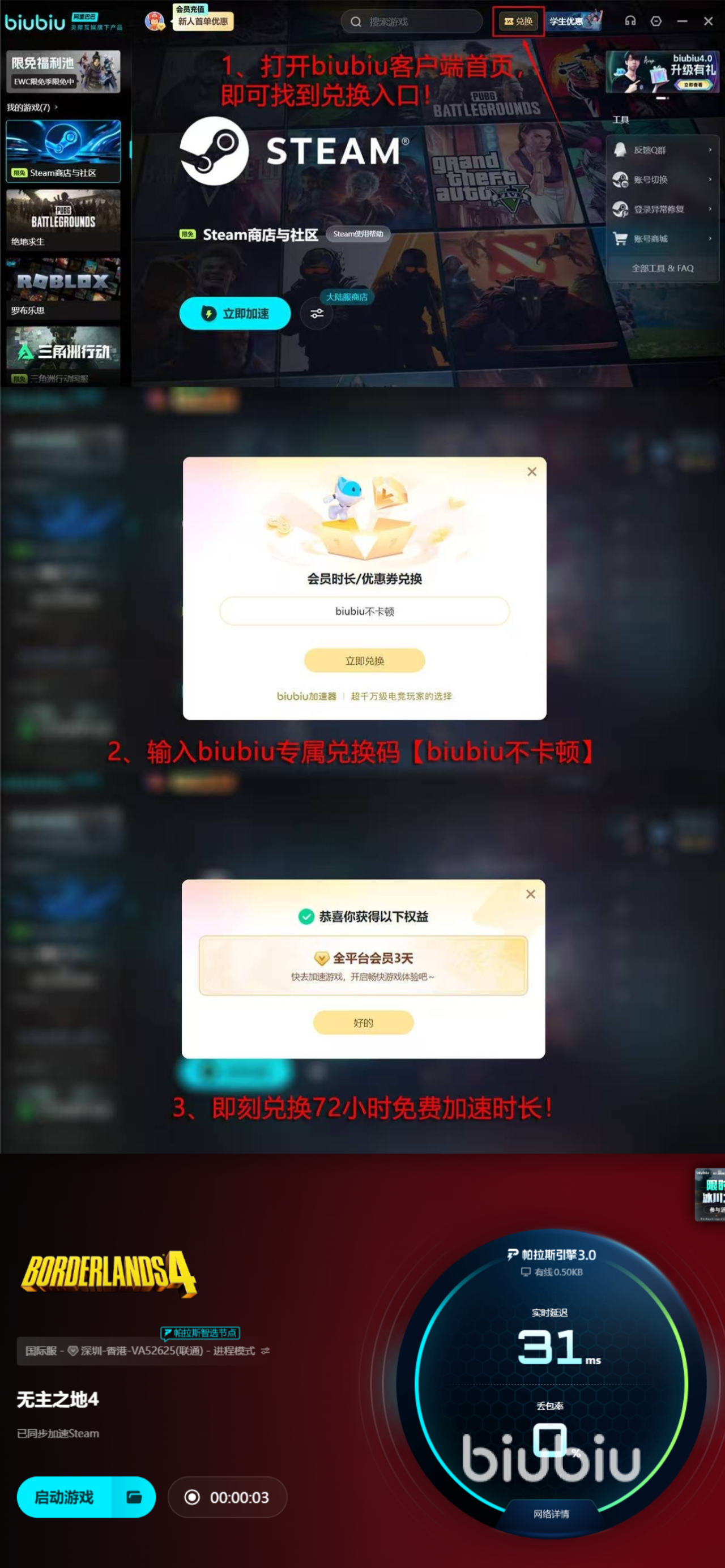 为了感谢这么久以来新老用户的支持和肯定,特别为大家准备了丰厚的福利活动,比如新人的第一次尝试,在完成注册之后就可以拿到平台赠送的24h免费优化时间。结束之后跟随平台的其他用户,通过【biubiu不卡顿】还能兑换到三天的继续体验时长。