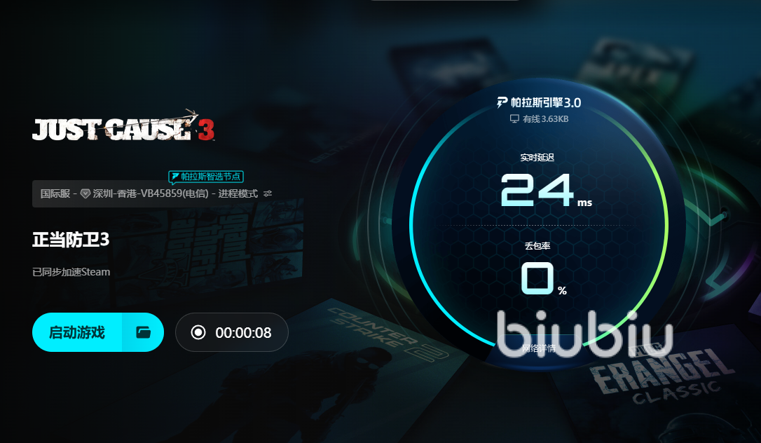 在适配《正当防卫3》的加速工具中,biubiu加速器是口碑颇高的选择。它针对这类开放世界游戏的数据传输特性做了专项优化,能精准识别游戏的资源加载请求,避免因数据拥堵导致的闪退。新用户注册后可直接获得24小时免费时长,足够完整测试加速效果,输入口令【biubiu不卡顿】还能额外兑换72小时时长,近四天的免费体验期能让玩家充分感受优化前后的差异。而且biubiu引入帕拉斯引擎3.0后实现了重磅升级,能实时规避拥堵节点,即便在网络高峰时段也能保持传输稳定。
