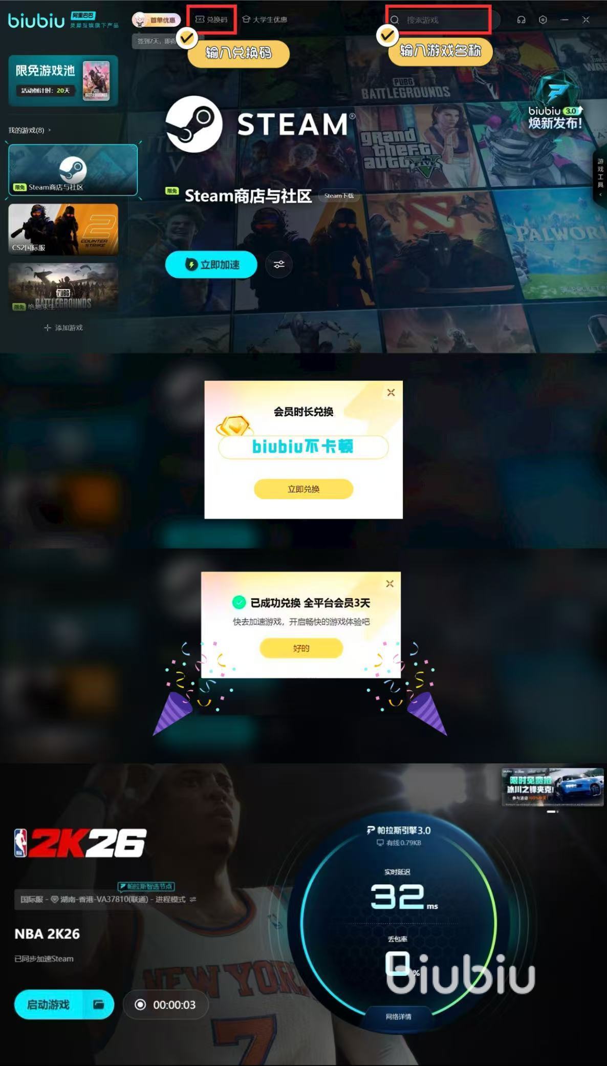 但即便掌握了完整步骤,网络波动仍可能成为联机路上的阻碍,此时biubiu加速器的升级功能便能发挥关键作用。其引入的帕拉斯引擎3.0采用智能路由优化算法,实时监测全球多个节点状态,有效降低跨区联机延迟,biubiu与冠军选手Aixleft合作,对游戏中一些内容进行专项优化,让传球、投篮等关键指令获得优先传输保障,确保操作同步。新用户注册就可以领取24小时免费时长,输入口令【biubiu不卡顿】还能额外获得72小时体验,足以完整感受联机优化效果。