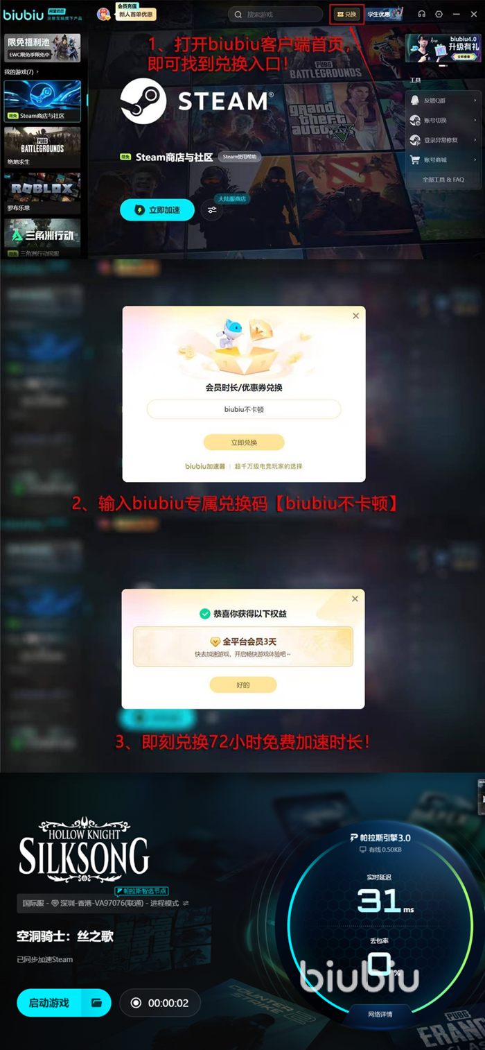 当然了,还有部分玩家反馈空洞骑士丝之歌的优化和翻译问题,不管是跑图探索还是与boss交战时都有几率出现明显卡顿或者是闪退的情况,这里小编推荐使用biubiu加速器来解决。新用户下载biubiu后完成注册就可以直接获赠24小时免费加速时长,可以保证在试玩或体验游戏的时候不会遇到卡顿。如果想要入坑并且通关本作,在biubiu内使用兑换码“biubiu不卡顿”领取3天免费加速时间,一般来说也足够打通本作了,丝之歌的流程大概是50个小时左右。