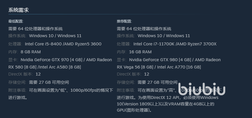 官方是选择登录pc平台的,所以具体的配置需求也是同步公开了。我们现在去steam上面就可看到具体的内容。i5-8400的处理器搭配上GTX 970是最为基础的搭配组合,只能达到最低要求,简单运行游戏程序。如果想要更好的显示效果,建议提升处理器为i7-11700K,显卡可以升为980,有更高版本更好。另外存储空间要求不大,有27GB就够了,运行内存直接弄高点,有16gb就会运行的更快。