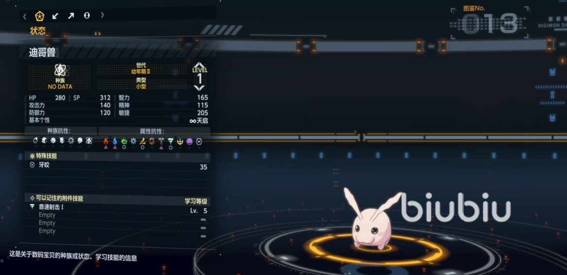 013、迪哥兽为小型宠物,外表粉色,技能为牙咬,会造成45点威力的无物理攻击。其音速射击技能则是造成40点的风魔法伤害,要5级才会。