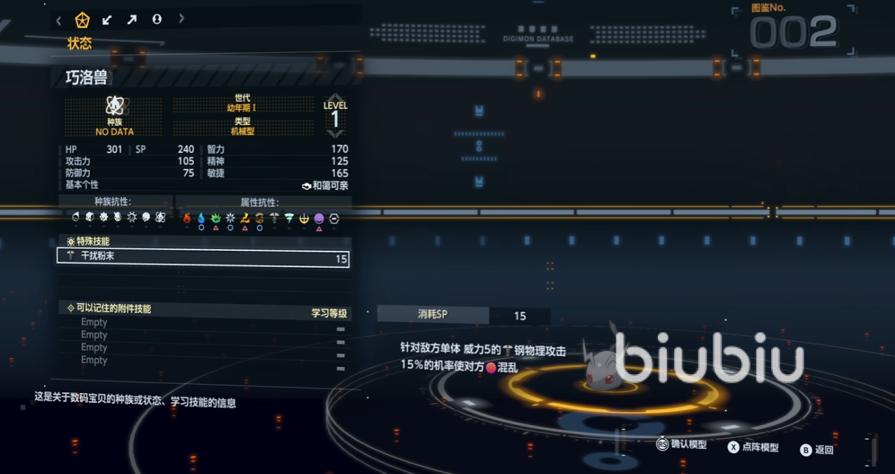 002、巧洛兽,特殊技能为干扰粉末,单体攻击,命中有15%的概率混乱对手。