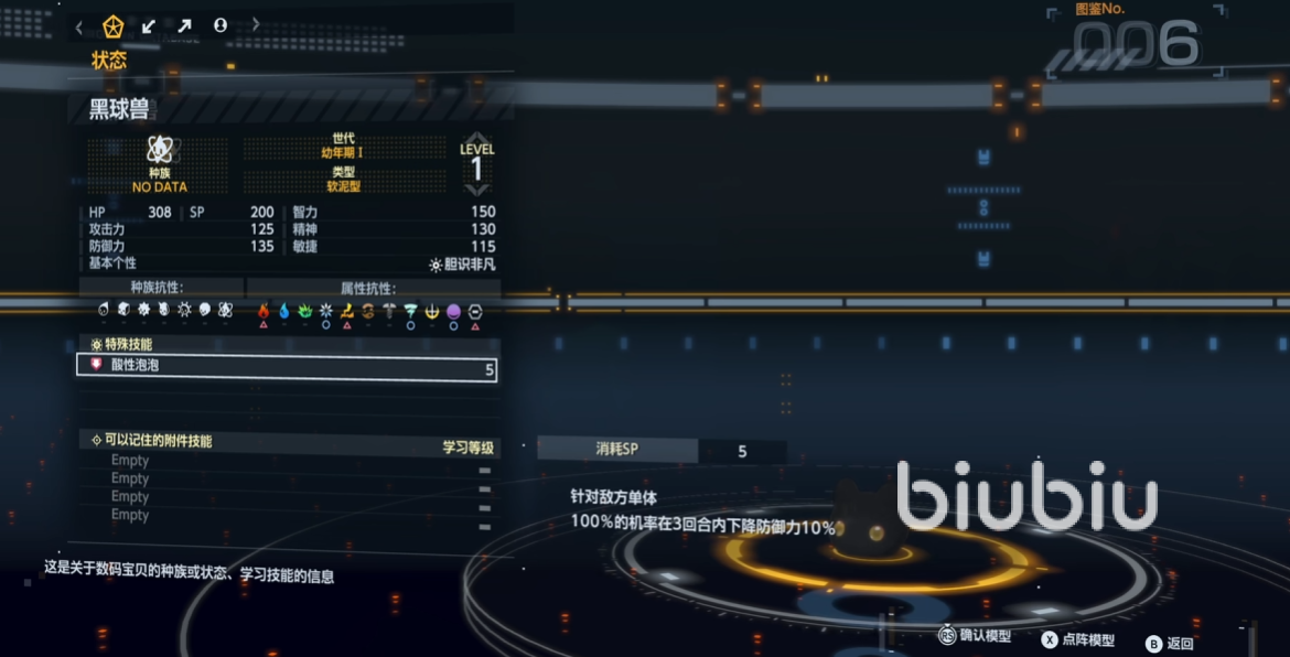 006、黑球兽全身漆黑,技能同布尼兽是一样的,酸性泡泡可降低防御,只是外观不同。