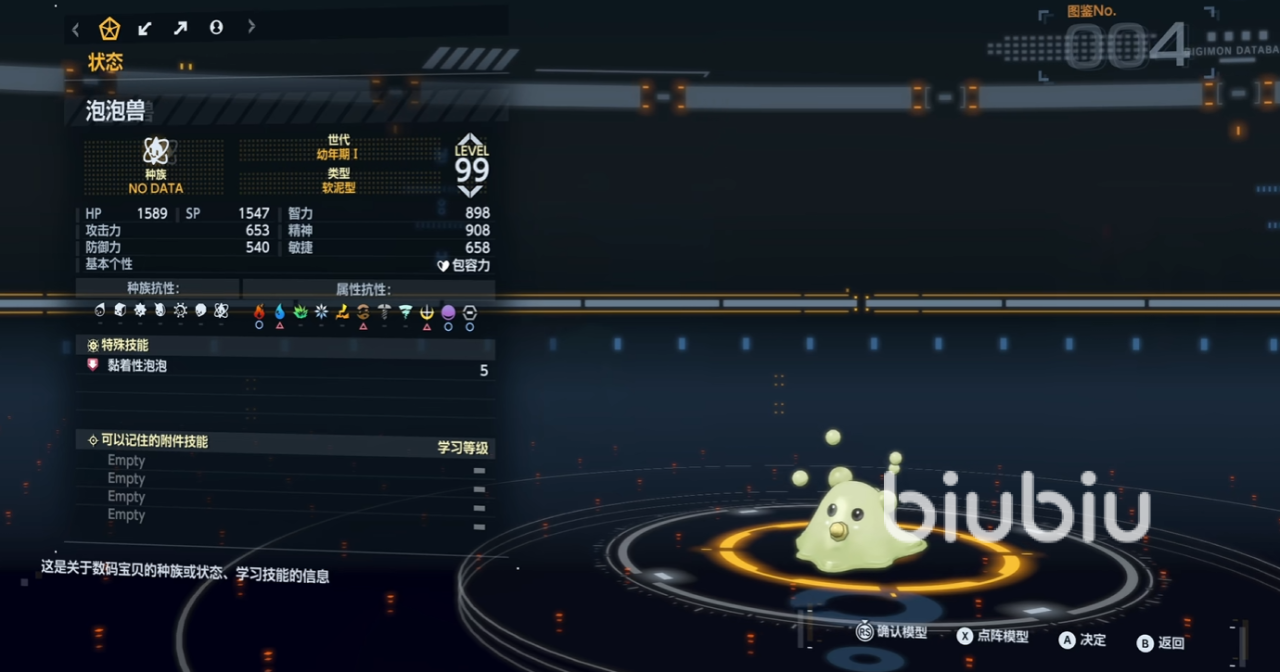 004、泡泡兽可释放黏着性泡泡技能,针对单体进行攻击,还有100%的概率在3回合内下降目标速度10%。