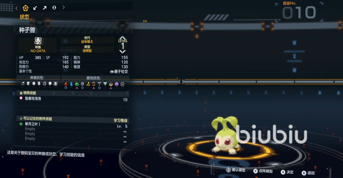 010、种子兽看上去就像一个小种子,释放的为黏着性泡泡,效果是3回合内让敌人速度下降15%,5级时会学习新月之叶技能,命中率为95%,对敌人造成威力为6*7的草木物理伤害。