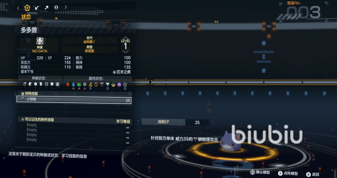 003、多多兽,技能为小铁粒,单体攻击,可以造成35的钢物理伤害。