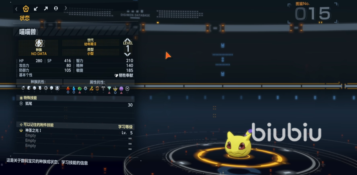 015、喵喵兽就像黄色小猫,对单体目标造成30点的无物理伤害,还可以在3回合内让敌人速度下降20%,5级学会的神圣之光技能命中率为95%,会造成40点光伤害。