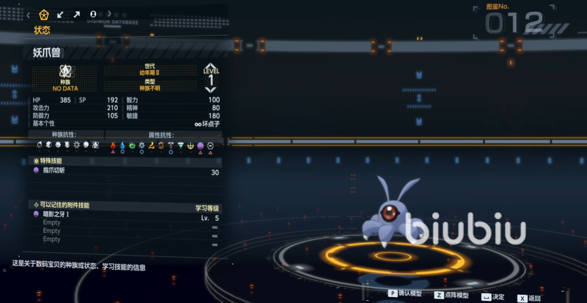 012、独眼多爪类似于章鱼的妖爪兽,技能为指爪切断,可以造成40点暗物理伤害,学会技能暗影之牙后可造成20*2威力的暗物理攻击。